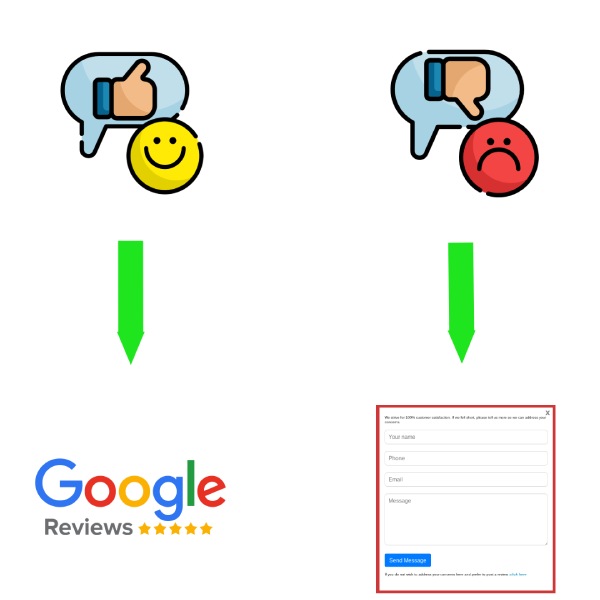 Direct satisfied customers to your Google Business page to leave a 5-star review. Unsatisfied customers are guided to a private feedback form, allowing you to address concerns directly.